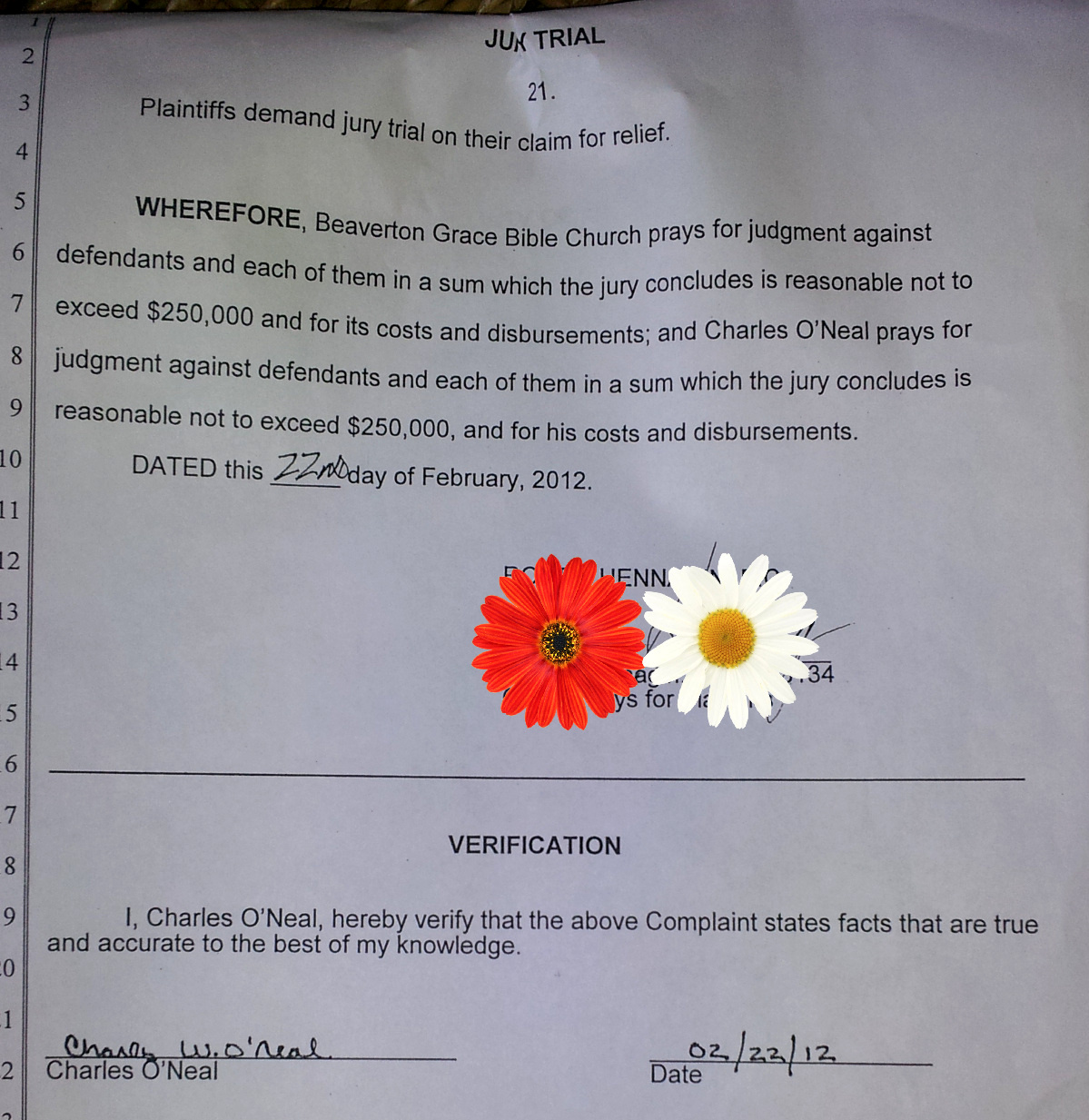 When I got home from taking my daughter to volleyball practice the other night, my husband told me that a person knocked at the door and hand-delivered some papers that he had to sign for. I was handed a pile of legal-looking papers. I want to inform my readers that Chuck O’Neal and Beaverton Grace Bible Church have filed a legal suit against me and 3 others for defamation with damages to the tune of $500,000. The summary outlines snippets of quotes from review sites and blog comments.