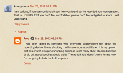 Later, Meaghan added a followup comment sharing her experience with Chuck O’Neal using a recording device. Here is her story copied directly from the comments section. Meaghan’s story needs to be read. It is important and shows the type of treatment she and many others endured at the church, but was never able to share because of shunning.