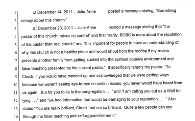 I'm on Julia's side. Because I've seen this, not at this church but others and it's all over the media, everyday we read online or hear on the news about someone in a position of power abused it, politicians, teachers, police officers, businessmen, sports professionals; CHURCH LEADERS are in the spotlight everyday, I can't recall the last time I watched the news and haven't heard about some scandal involving a church and it's people in a position of authority. I say let him sue you, I doubt he will win because you can't take away freedom of speech. regardless of the outcome, he and all these people will get what is coming to them, and it won't be any form of justice we can comprehend or dole out.