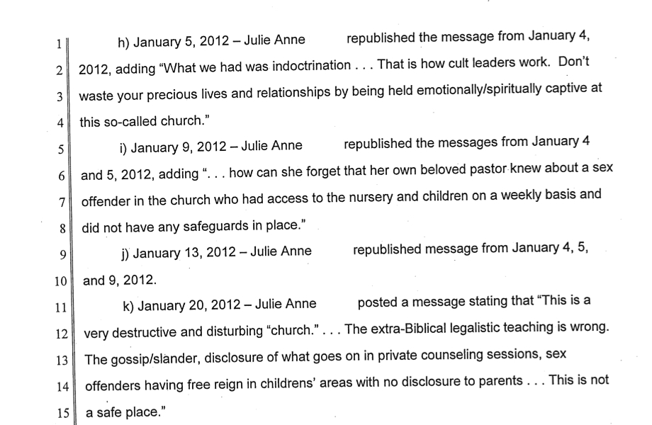 I'm on Julia's side. Because I've seen this, not at this church but others and it's all over the media, everyday we read online or hear on the news about someone in a position of power abused it, politicians, teachers, police officers, businessmen, sports professionals; CHURCH LEADERS are in the spotlight everyday, I can't recall the last time I watched the news and haven't heard about some scandal involving a church and it's people in a position of authority. I say let him sue you, I doubt he will win because you can't take away freedom of speech. regardless of the outcome, he and all these people will get what is coming to them, and it won't be any form of justice we can comprehend or dole out.