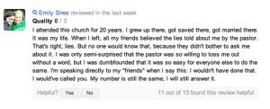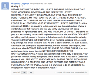 I think most people will be able to see that the recent barrage of reviews was clearly a response to the media. My point of posting Ed's here is to show that the manipulating of the reviews is continuing. BTW didn't I read where you never actually joined the church? After you leave the church you are no longer under the by-laws, right? Yes, you are correct and raise great points. As I was trying to point out above, one would know if they had been involved in a church discipline process. You don't hear about it from someone else (or on Google reviews as we discovered). That's just ridiculous. The other point that you are mentioning is a good one, too. In order for us to have been in a church discipline process, we would have had to be members. We were never official members. Further, the church discipline process would never be initiated against someone who had left the church. This clearly shows that what the pastor did/said was out of line. He makes up rules as he goes (against the church's by-laws) and spreads false information to church members. Why the church members cannot realize very clear violation of the church by-laws is beyond me.