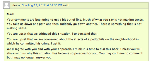 So, after that little episode, I surfed to another one of my favorite blogs – The Wartburg Watch, and read a current post. The same kind of thing was going on over there. Someone was sympathizing with an abuser. Ack. Here you can see blogger Dee’s words with Mark, a commenter who seems to feel that it’s wrong to expose a pedophile.