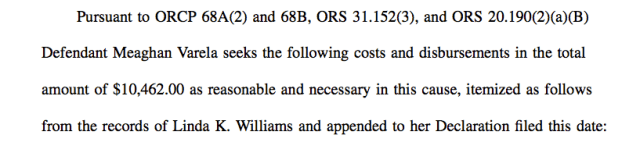 1. Wow.So, if I understand this right, your (very competent) lawyer argued that, according to Oregon state law, the plaintiffs' lawsuit included aspects that were ill-considered, ill-prepared, unreasoned, and unreasonable. Also, there was the demonstrated problem of attempting to by-pass anti-SLAPP statutes by issuing an "intent" to depose more witnesses. This was all evidence that the defamation lawsuit was indeed unwarranted and frivolous. So now, the plaintiffs … but basically, the congregation, who (I'm assuming) pays their co-plaintiff pastor's salary … will owe $60,000. Assuming the judge so rules, this will cost them perhaps a year's worth of Pastor O'Neal's salary for following his leadership. And there is still the potential issue of whether they/he will appeal. Their evidence can't get any better. Wouldn't it be best if they quit while they're only this far behind?
