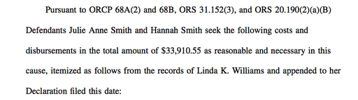 1. Wow.So, if I understand this right, your (very competent) lawyer argued that, according to Oregon state law, the plaintiffs' lawsuit included aspects that were ill-considered, ill-prepared, unreasoned, and unreasonable. Also, there was the demonstrated problem of attempting to by-pass anti-SLAPP statutes by issuing an "intent" to depose more witnesses. This was all evidence that the defamation lawsuit was indeed unwarranted and frivolous. So now, the plaintiffs … but basically, the congregation, who (I'm assuming) pays their co-plaintiff pastor's salary … will owe $60,000. Assuming the judge so rules, this will cost them perhaps a year's worth of Pastor O'Neal's salary for following his leadership. And there is still the potential issue of whether they/he will appeal. Their evidence can't get any better. Wouldn't it be best if they quit while they're only this far behind?