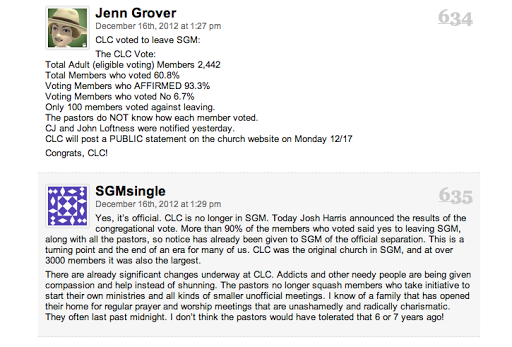 My hope and prayer is that they will throw away the SGM polity and start fresh with much more member involvement. They will have a lot of work ahead of them, but this was a necessary start. We need to pray for those folks as they maneuver unchartered waters on their own.