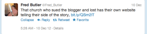 Another interesting note: even though Fred has a strong distaste for survivor blogs, he seems to give a pass to Chuck O’Neal’s “survivor blog.” Check out this tweet from Fred and notice the date of December 10. Obviously, Fred obtained information about O’Neal’s new blog and tweeted about it even before BGBC members first started commenting on December 11, 2012. After what Fred trashed my daughter publicly and eventually apologized, you would think he would have washed his hands from dealing with Chuck, but noooooooooo, he still meddles. Shame on you, Fred. You will have to answer for your behavior.