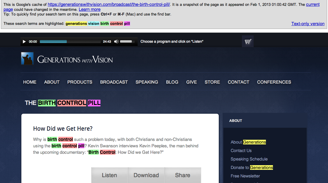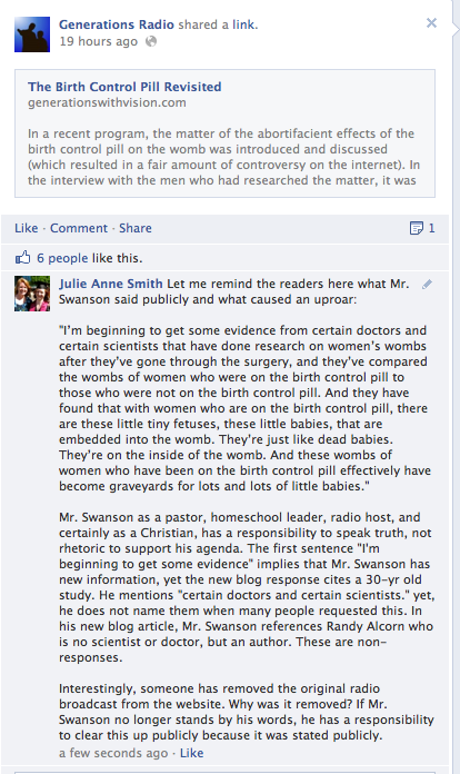 On his Generations Radio Facebook page, there is a link to his new blog post response: The Birth Control Revisited. I have added my comment on Facebook. I’m still waiting for one of two things: Mr. Swanson to cite real sources from doctors/scientists or to retract his comment.
