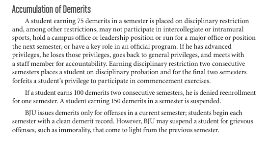BJU uses a demerit system to track disciplinary offenses. Minor offenses receive 1–25 demerits, while major offenses receive 50–150 demerits.