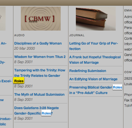 Going back to the complementarian topic, the gospel message is simple and clear and a child can understand the message. I do not believe the gospel message is about gender roles within a marriage, but these men appear to be making it so, causing this emphasis to become a distraction to me. Here is a screen shot taken last week of the CBMW home page showing highlight the word “roles” in their current articles/publications: