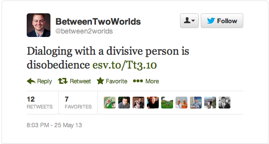 The other context of that passage is “debates, disputes, etc. about the LAW.” This was a big deal in the first century because there were some who denied “our freedom in Christ’ as Paul said, and insisted believers should obey the Law of Moses. So, the context is not just any dispute… I mean even Jesus and Paul had disputes.. but disputes about the Law by those pushing it and making the good news of Jesus into a legalistic treadmill. It wasn’t just any “divisive” person, but one still trying to argue for a law-based gospel. This tweet is Bible abuse through and through if in fact the intention was to stifle people who are complaining about Mahaney still in public eye during this case. This is one problem with looking at the Bible like a rulebook; it becomes so easy for someone in leadership to manipulate it to say what they want and control the masses, instead of letting people think for themselves.
