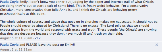 In the article, reporter Sara Sneath also interviewed former church member, Emily Sires. You can read about her encounter with the O’Neals outside an ice cream shop here. I am absolutely disgusted – disgusted doesn’t even cut it – at what church member Sketch has posted in her comments about Emily. Emily, you are one brave young woman for standing up publicly to these bullies. I am so proud of you. Sketch is only revealing her heart – exhibiting the same stone-cold heart that she has learned from her bully pastor who really doesn’t understand the love of Christ.