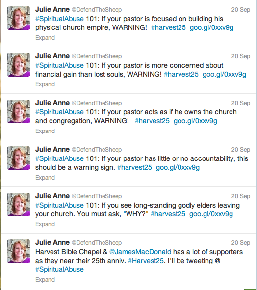 You’ll notice the hashtag #Harvest25.  I was trying to find HBC’s Twitter handle, but couldn’t find it.  I did, however, find the #Harvest25 hashtag when looking at James MacDonald’s Twitter feed.  Harvest25 refers to the celebration they had last Saturday – – they were celebrating the church’s 25th anniversary and had a pretty big shin dig.  So, in between the celebratory tweets, I was tweeting about #SpiritualAbuse 101.