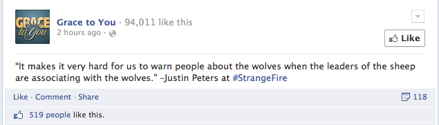 “It makes it very hard for us to warn people about the wolves when the leaders of the sheep are associating with the wolves.” –Justin Peters at #StrangeFire