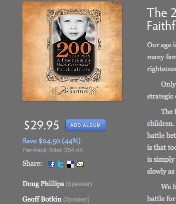 I’d like to spotlight some of the common teachings and practices that Doug Phillips and Vision Forum promoted. Many of these teachings go far beyond Doug Phillips and Vision Forum and have spread via homeschool networking, family-integrated church networking, the internet.