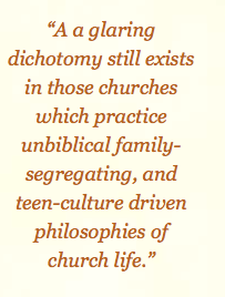 At a time when God is turning the hearts of many fathers to their children, and where biblical patterns of Hebrew discipleship are being rediscovered and implemented in the homes of many families who have embraced home education, a glaring dichotomy still exists in those churches which practice unbiblical family-segregating, and teen-culture driven philosophies of church life.  (Source)