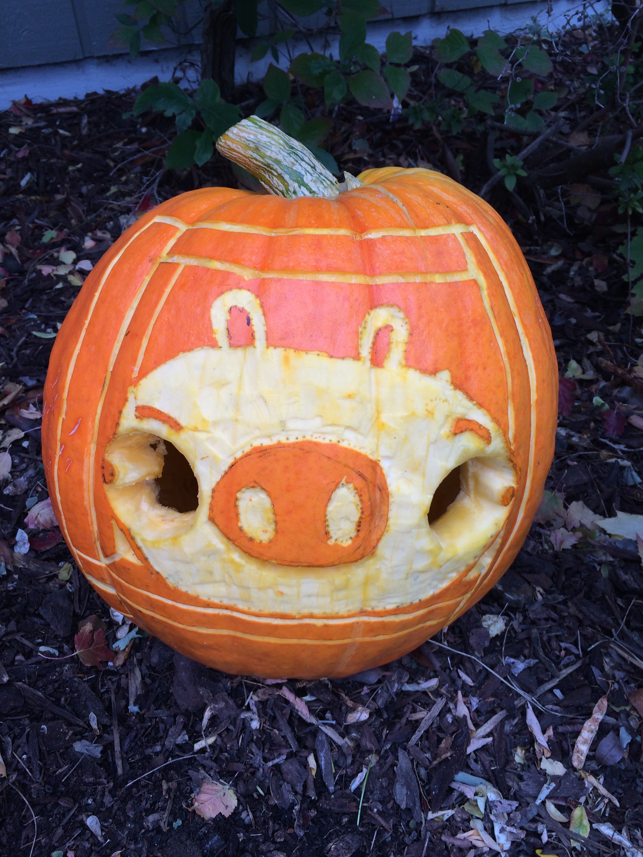 This year, we’re on an Angry Bird theme with our home-grown very large pumpkins. We have two done already.  My  24- and 17-yr old sons did this one: