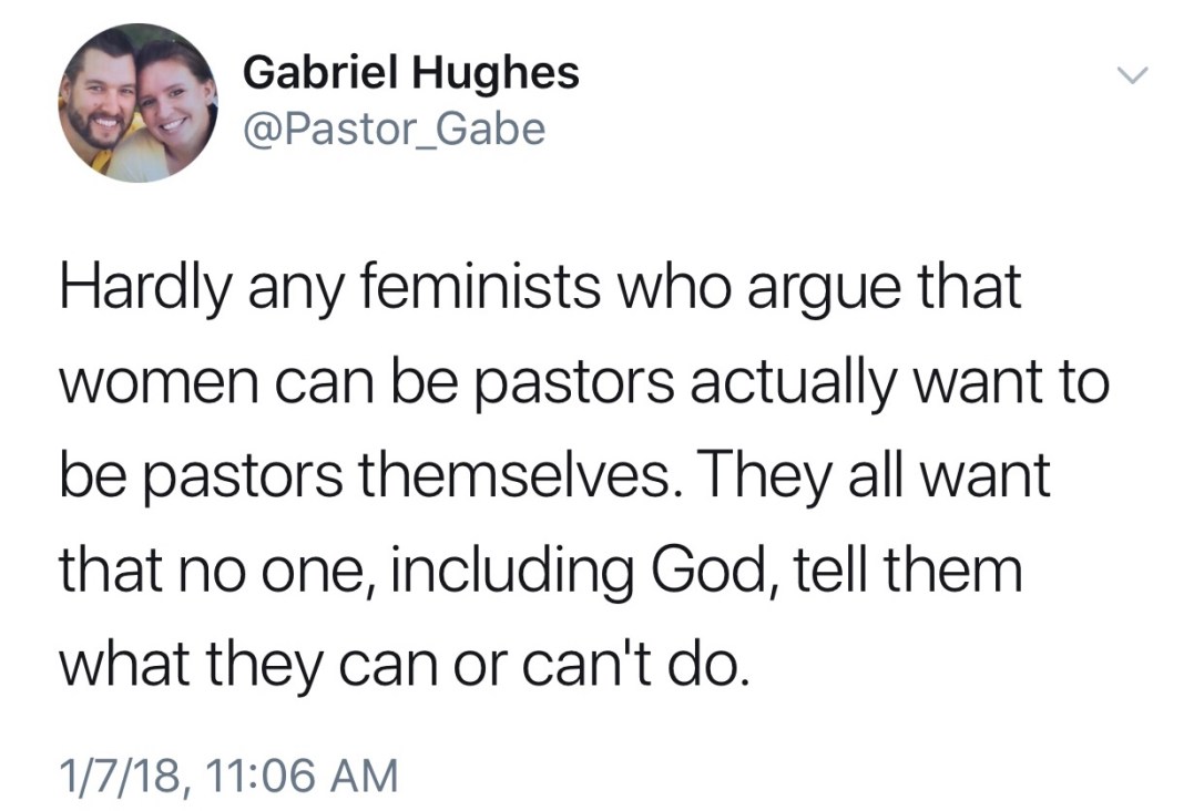 My argument isn’t that women should become ordained preachers, but the tweet is ridiculous as well as rude. Would Pastor Hughes be happy if a bunch of “feminist” women became preachers? I don’t think so. Egalitarianism and feminism are different belief systems too.