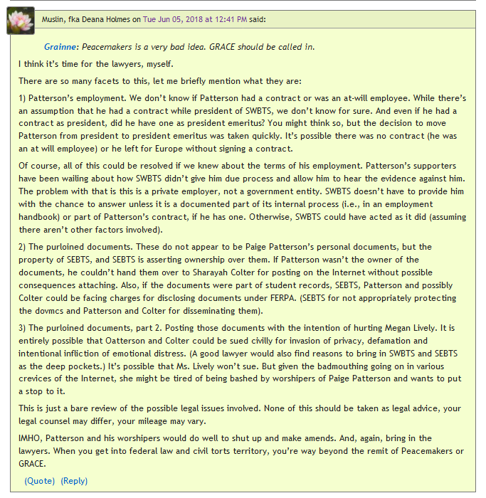 In responding to certain of these accusations, Ms. Colter posts pages of documents reportedly from the situation with Megan Lively. However, these apparently are from Ms. Lively’s SEBTS student file, which are confidential and protected by law (FERPA). This has become an ongoing issue.
