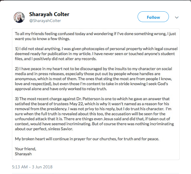 June 03, 2018. Sharayah Colter’s response on Twitter to push-back about her SBC Issues article from May 31. Questions remain about who the “legal counsel” is whom she mentioned in her first point.