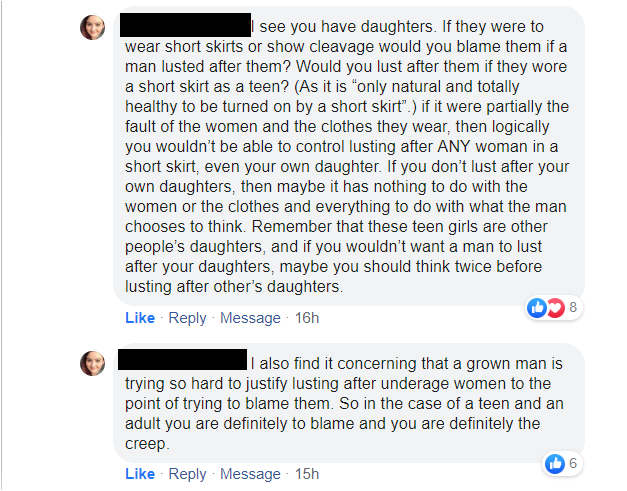 We have a long ways to go if we are unable to convince this Christian man that the onus is on him to control his lusts. And as someone mentioned above, he has daughters of his own – how is he able to not lust after his daughters? By controlling himself. The same control needs to be applied everywhere – not just because they are minors, but because Jesus said so.