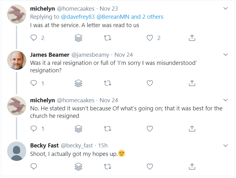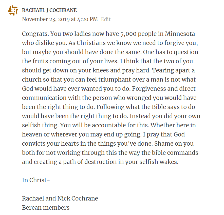 And finally, this comment was left on my old post from a congregant of Berean Baptist. When you have a pastor you love and respect, it is very difficult to hear anything bad about them, even when truth is exposed. The anger needs to go somewhere, I guess.