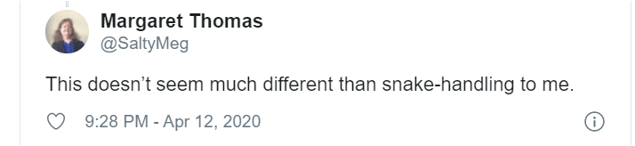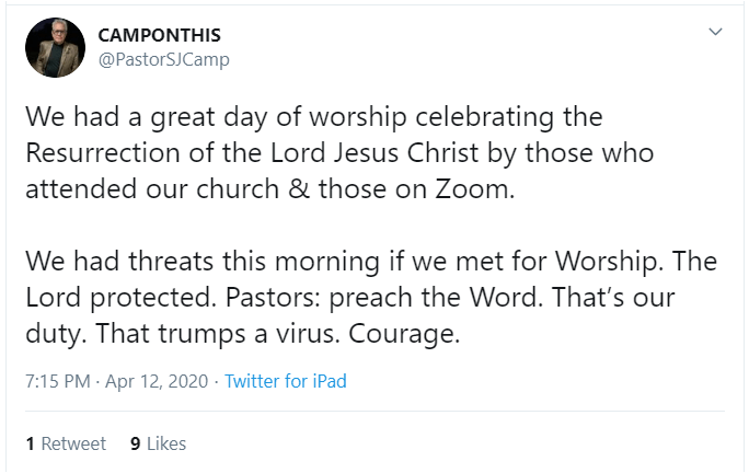 It’s interesting that Steve says “the Lord protected.” It’s a little early to celebrate that — has Steve not paid attention to the news to know there is a lengthy incubation period for Clovid-19? There is no way for Pastor Camp to know whether he or his congregants were protected from the virus after meeting together at church on Easter Sunday.