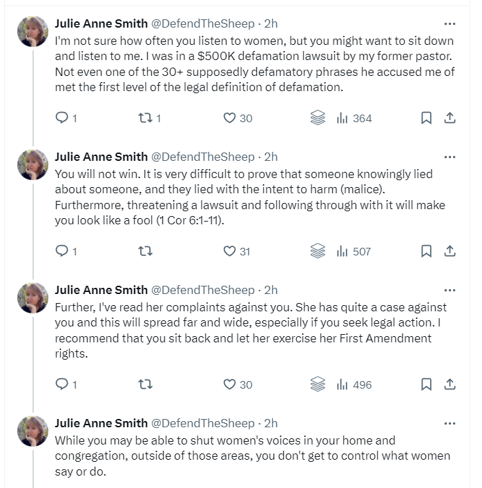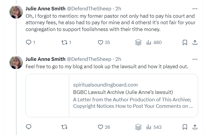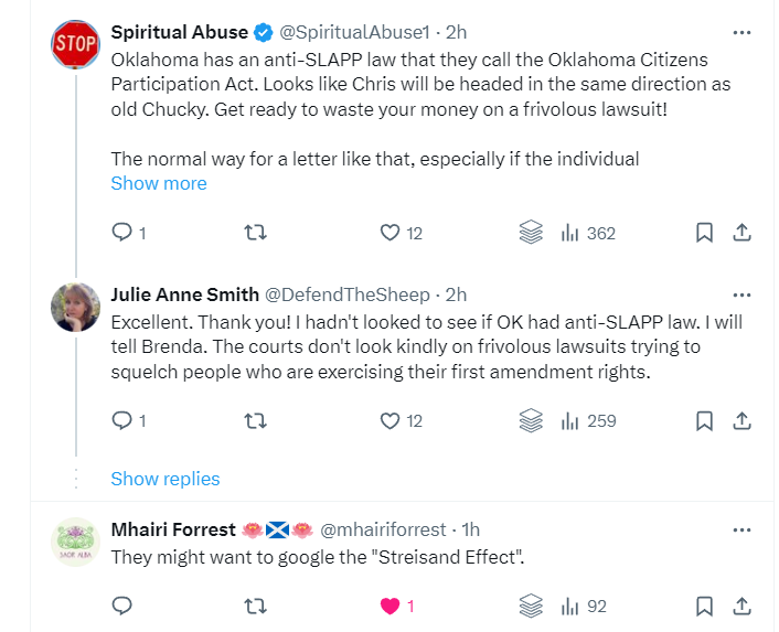My long-time online friend, Lois, chimed in to let me know that Oklahoma has an anti-SLAPP law which will certainly be in Brenda’s favor should the pastor foolishly sue her.